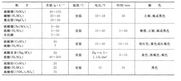 鋁及鋁合金經(jīng)過陽(yáng)極氧化后,再放人含有鎳鹽、鉆鹽、錫鹽或銅鹽等溶液中進(jìn)行交流電解,使膜孔底部沉積上金屬鎳、鈷、錫或銅等而呈現(xiàn)出不同的色彩。該工藝具有工藝簡(jiǎn)單、能耗低、著色均勻、生產(chǎn)效率高等特點(diǎn)。表7—4列舉了鋁及鋁合金的電解著色工藝。